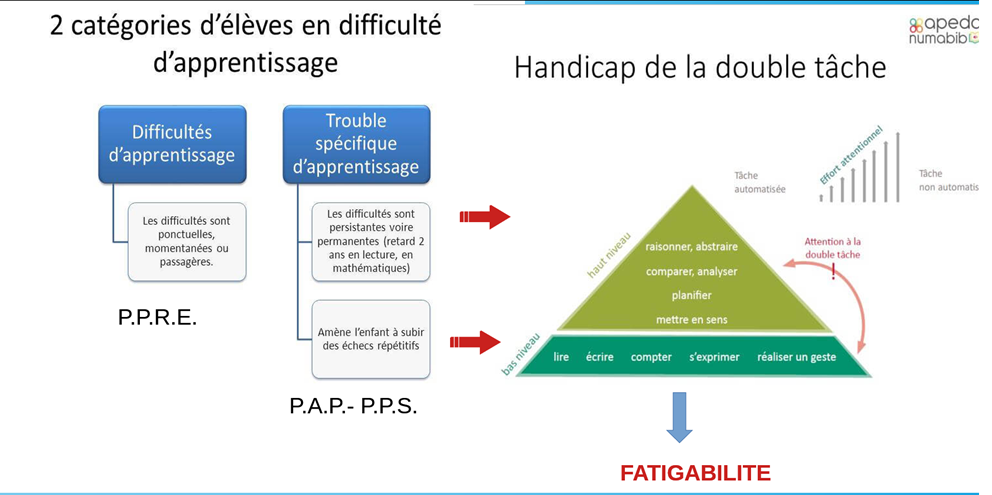 La fatigabilité pour certains élèves constitue une véritable limitation de l’activité et de la participation à la vie scolaire. Cette fatigabilité peut être physique et cognitive. Dans certains cas, il s’agit d’épuisement, de lassitude extrême, de découragement, d'irritabilité… Dans ces situations, la fatigue physique et la fatigue mentale ne sont plus dissociables.